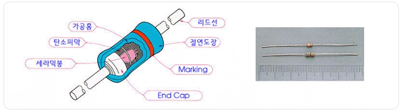 Ceramic봉에 금속산화물(주석 또는 안티몬계)피막을 붙이고, 양끝에는 Lead선을 붙인 금속Cap을 끼워 넣고, 여기에 나선형으로 홈을 파서 원하는 저항 값으로 한 것이다.