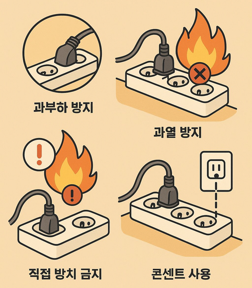 멀티탭 화재는 대부분 "사용자의 습관" 때문이며, 조금만 신경 쓰면 거의 100% 예방 가능합니다.