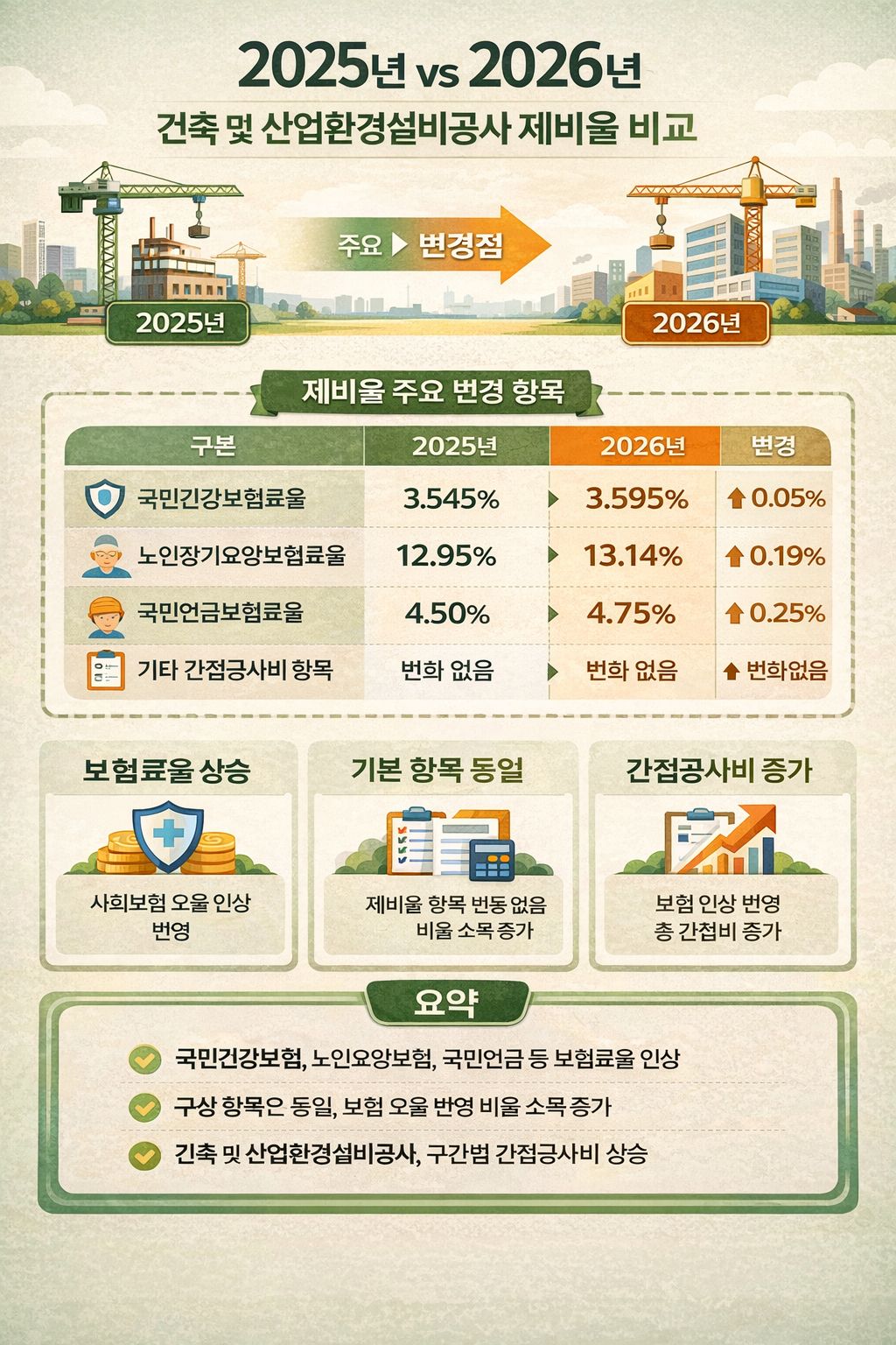 아래는 2026년 조달청 건축·산업환경설비공사 간접공사비(제비율표)와 2025년 대비 변경된 주요 내용에 대한 정리입니다.