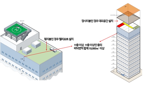 · 대상 : 층수가 11층 이상인 건축물로서 11층 이상인 층의 바닥면적 합계가 10,000㎡ 이상인 건축물.