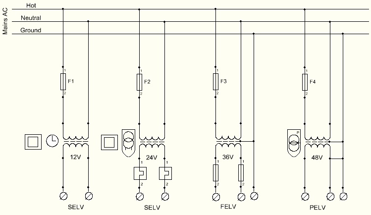 [주] 특별저압(Extra Low Voltage : 2차 전압이 AC50[V], DC120[V]이하)으로 SELV(비접지회로 구성) 및 PELV(접지회로 구성)은 1차와 2차가 전기적으로 절연된 호로, FELV는 1차와 2차가 전기적으로 절연되지 않은 회로를 뜻함