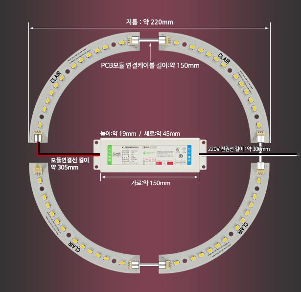 클래어G3 원형 LED 써클라인 제품은 PCB 모듈 4장과 15W 전용 플리커 프리 컨버터가 같이 구성되어있는 상품입니다.