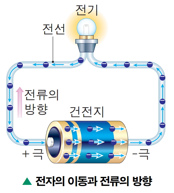 한다. 전자는(-) 극에서(+) 극으로 이동하고, 전류는(+) 극에서(-) 극으로 흐른다. 이는 전자의 존재가 밝혀 지기 전에 전류의 흐름 방향을 반대로 정의했기 때문이다.