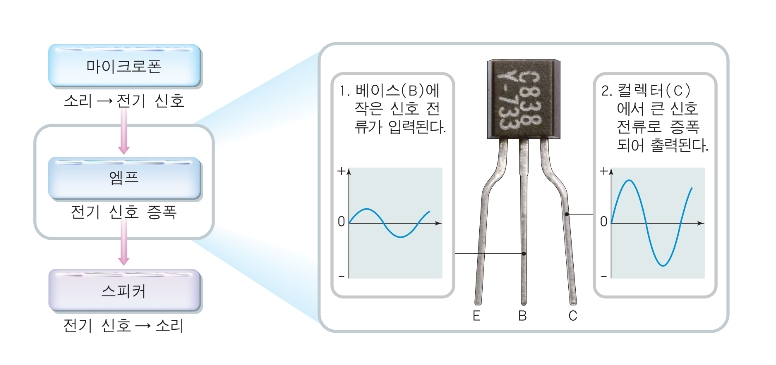 스피커, 앰프, 라디오 등의 부품으로 사용되는 트랜지스터는 마이크에서 전달된 소리를 크게 하는 역할을 함