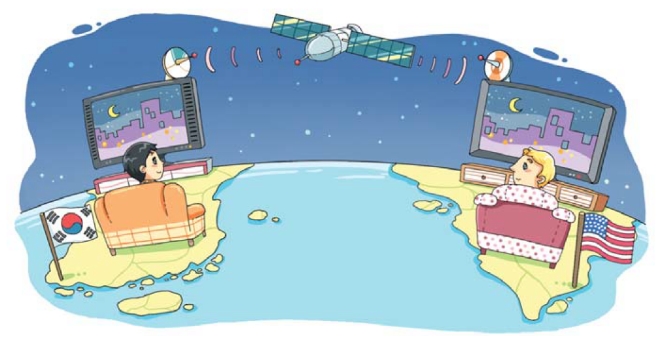▶ 위성 궤도에서 지구 주위를 돌고 있는 인공위성이 전 세계의 방송과 통신을 중계해 줌. 이로 인해 지구 건너편의 소식도 신속하게 접할 수 있게 되었으며, 전 세계에서 같은 방송을 동시에 접할 수 있게 되었음 |