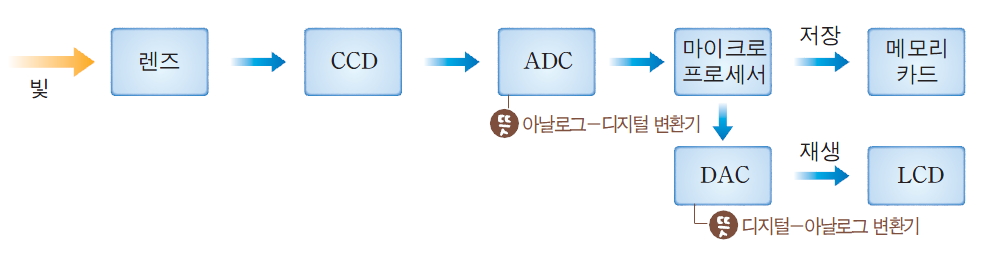 ③ 영상의 저장과 : 재생 렌즈로 들어온 빛은 CCD에서 전기 신호로 변환되고, 다시 ADC에서 디지털신호로 바뀌어 메모리 카드에 저장된다. 영상 정보는LCD를 이용해 재생한다.