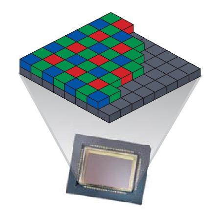 ② 영상 정보의 기록 : CCD는 기본적으로 빛의 세기만 측정하므로 색을 인식하기 위해서 CCD 소자 위에 색 필터를 설치하고, 각 필터를 통과한 빛의 세기를 측정하여 영상 정보를 기록한다.