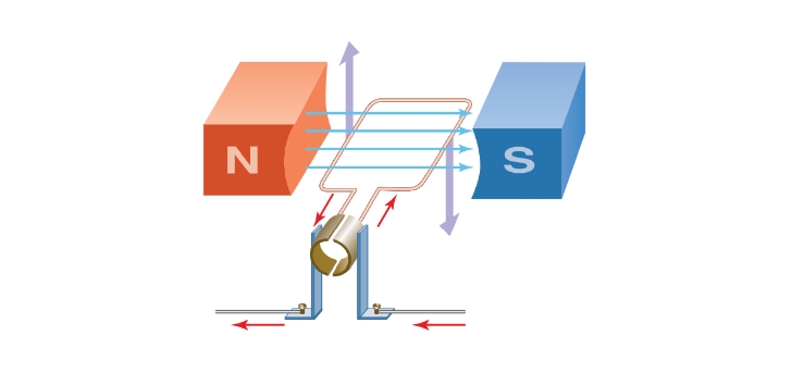 자석 사이에 있는 코일에 전류가 흐를 때 자석과 코일 사이에 작용하는 자기력에 의해 코일이 회전하게 됨