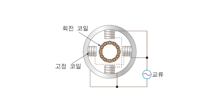 코일에 교류가 흐를 때 발생한 자기장의 변화에 의해 다른 코일에 전류가 유도될 때 자기력이 작용하여 코일이 회전하게 됨