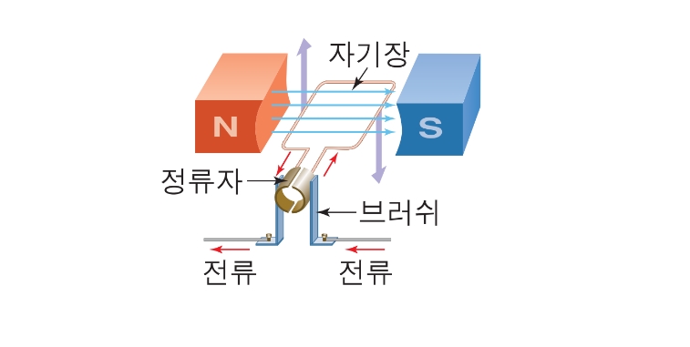 ① 외부에서 공급되는 직류 전류가 브러시와 정류자를 통해 코일에 흐르면 자석과 코일 사이에 자기력에 의한 돌림힘이 코일을 회전시킴