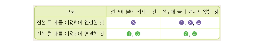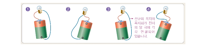 ▶ 전선 두 개를 이용하여 전지와 전구를 연결할 때, 전구에 불이 켜지는 것을 확인하여 봄