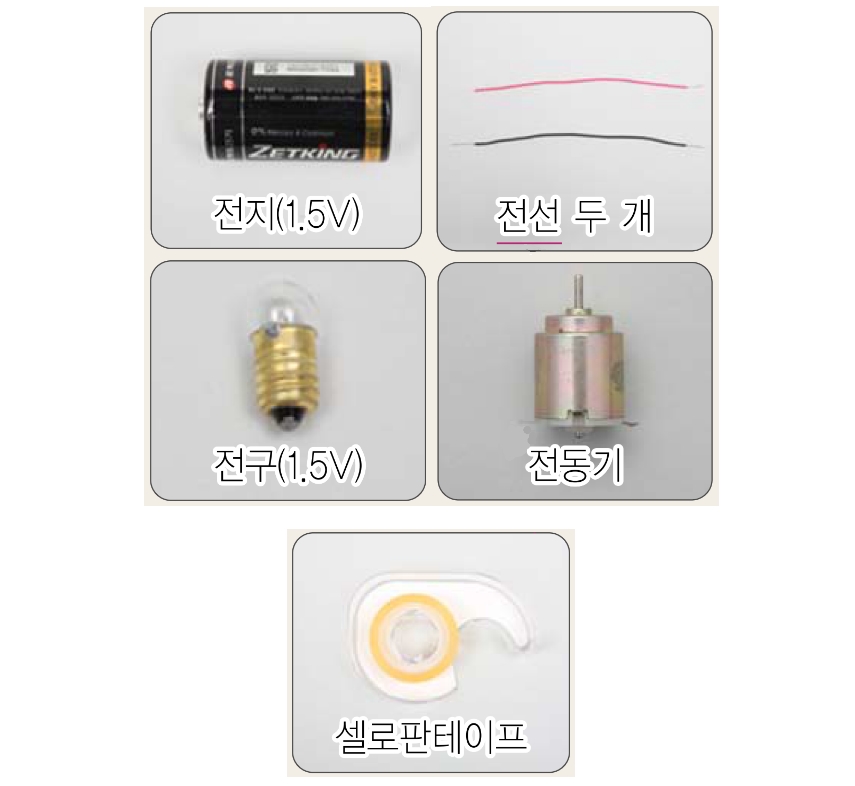 전지:전기 회로에 전류를 흐르게 하며, 전지의 양쪽 끝에는 모양이 서로 같거나 다른 (+)극과 (-)극이 있음