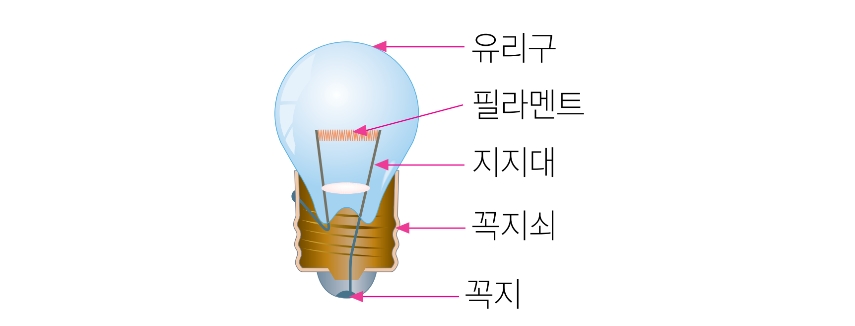 필라멘트:유리구 속에 들어 있는 용수철 모양의 가는 선으로, 텅스텐으로 되어 있음