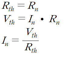 테브난 등가전압 Vth, 테브난 등가저항 Rth, 노턴 등가전류 In, 노턴 등가저항 Rn이라 할 때 다음의 관계를 갖습니다.