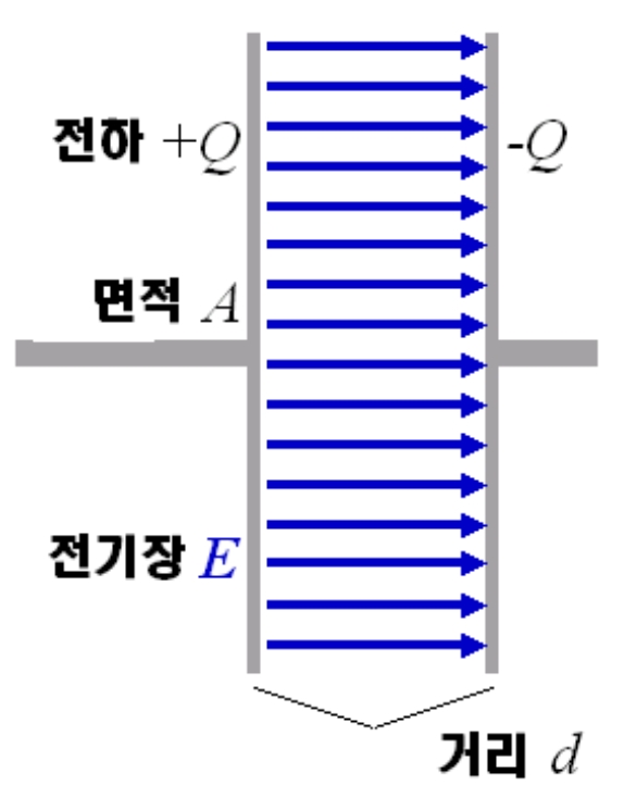 거리 d만큼 떨어진 두 평행판 사이에 전압 V가 인가되면,