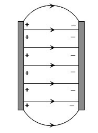 이 때, 도체판에 모인 양전하와 음전하 사이에는 쿨롱의 법칙(서로 부호가 반대인 두 전하 사이에는 전기력이 발생한다)에 의해 인력 F 가 발생하며, 이 인력으로부터 Electric Field E 가 발생합니다.