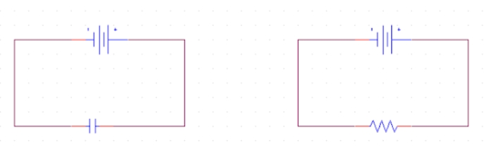 이 때, 오른쪽 그림처럼 전원대신 저항을 연결했을 때, 전류가 Capacitor로 흐르게 됩니다.