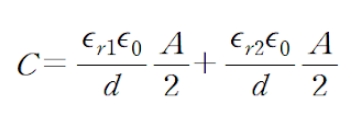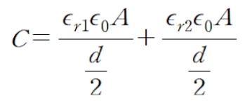 평행판의 면적이 A/2가 되므로 다음과 같이 Capacitance를 구할 수 있습니다.