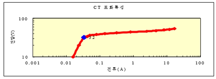 ⓔ [Pig.02]는 Metering용 CT의 TEST결과이다. 그림에 제시한 바와 같이 대상 CT는 약 32V(4배)에서 포화되기 시작했으며 10V에 0.016A의 오차가 발생하므로 1.0Class를 만족한다.
