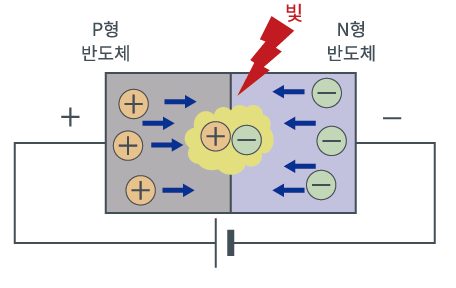 이 반도체에 순방향 전압을 인가하면, 전자와 정공이 이동하여 접합부에서 재결합하고, 이러한 재결합 에너지가 빛이 되어 방출됩니다.