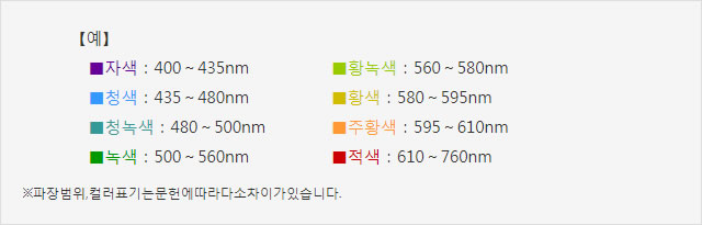 일반적으로 LED는 색을 파장으로 나타냅니다. 눈에 보이는 색에 상당하는 파장으로, 발광 파장의 피크 파장과는 차이가 있습니다.