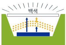 청색 LED와 그 보색인 황색 형광체를 조합하여 백색광을 얻는 방법.
