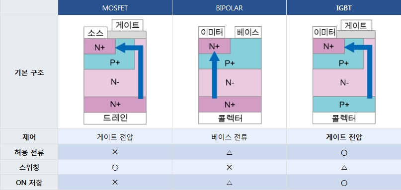 IGBT는 입력부가 MOSFET 구조, 출력부가 바이폴라 구조인 복합 디바이스로, 전자와 정공의 2종류 캐리어를 사용하는 바이폴라 소자이면서, 낮은 포화 전압 (파워 MOSFET의 저 ON 저항에 해당)과, 비교적 빠른 스위칭 특성을 양립시킨 트랜지스터입니다.