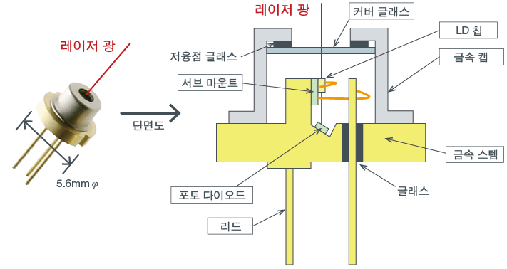 레이저 다이오드의 패키지는 업계 표준인 5.6mmφ CAN 타입이 주류입니다. 비용을 중시한 타입으로 커버 글래스가 없는 제품도 있습니다.