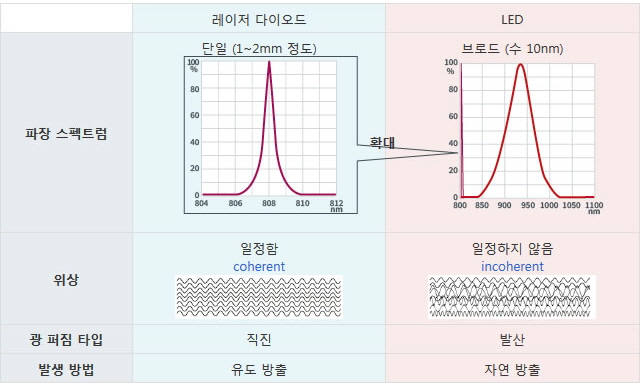 레이저 다이오드와 LED의 차이점을 하기 표로 정리하였습니다.