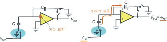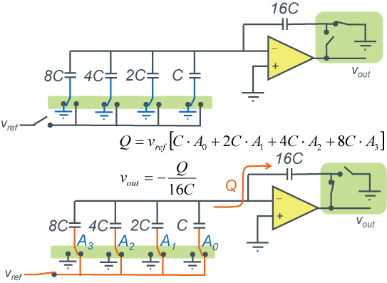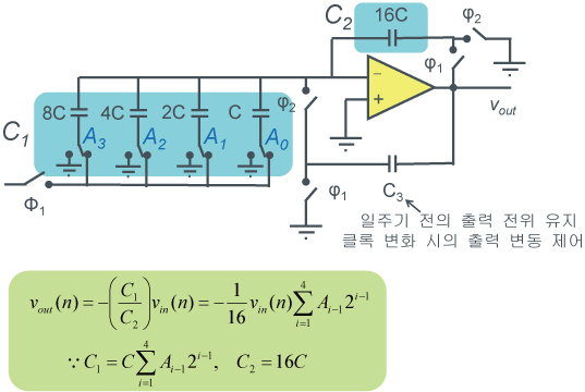 하기 그림은 콘덴서 사용 4bit 분해능 DAC 예입니다. A0~A3의 어느 스위치를 Vref측으로 전환하는가에 따라 다른 Vout 전압을 얻을 수 있습니다. 이때, 앰프 오른쪽의 스위치 2개가 동시에 ON되면, 전하 보존의 관계가 무너지므로 클록 신호를 사용하여 ON 시간이 오버랩되지 않도록 주의할 필요가 있습니다.