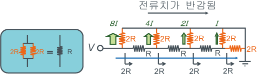 R-2R ladder 회로는 어느 노드에서나 저항치 2R의 병렬 접속으로 보이므로, 1노드당 전류치가 반감됩니다.