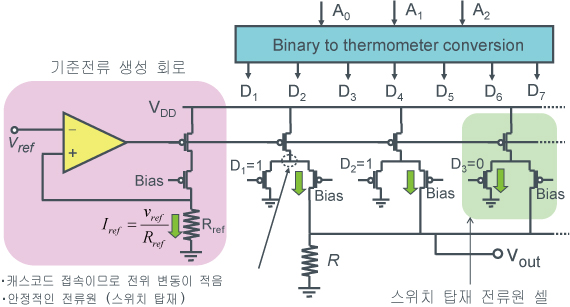 고속(수 MHz~)용도용 변환 방식입니다. 디지털 입력에 따라 전류원을 스위칭하여 출력전류를 전환합니다.