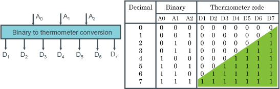 글리치를 억제할 수 있으나, 바이너리 코드를 서모미터 코드로 변환하는 디코더는 분해능에 따라 지수 함수적인 회로 규모가 됩니다.