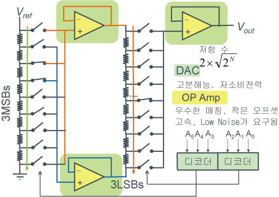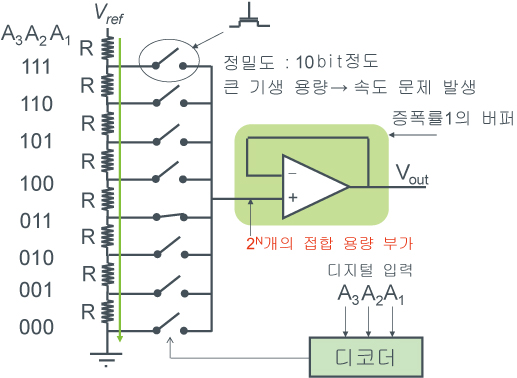 저항치를 작게하고, 후단의 버퍼 앰프를 고속으로 설정하면, 나름대로 고속 동작이 가능하지만, 고분해능에서는 스위치의 기생 용량때문에 동작 속도가 저하됩니다.