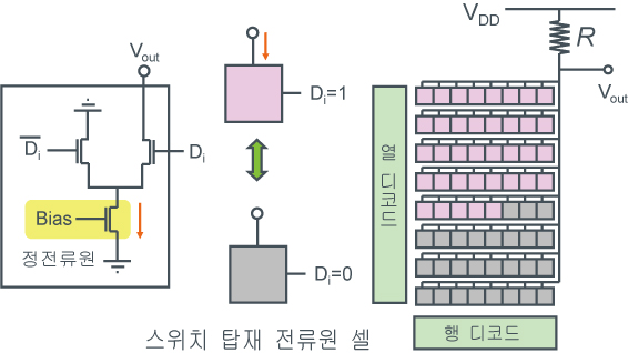 몇 개의 셀로 전류를 끌어오는가에 따라 출력전압 Vout이 결정되는 전류형 DAC입니다.