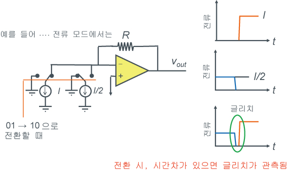 데이터 전환의 순간, 완전히 다른 전압 또는 전류가 출력되는 경우가 있어, 출력 아날로그 신호에 노이즈가 발생합니다.