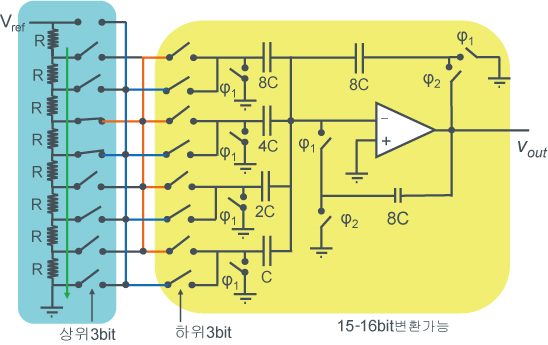 일반적으로 LSI는 저항보다 콘덴서쪽이 비정밀도가 좋으므로 중/고정밀도의 D/A 컨버터에서 많이 사용되는 방식입니다.