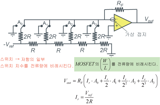 단점은 저항에 요구되는 비정밀도가 높으므로, 고정밀도를 구현하기 위해서는 스위치 (MOSFET 사이즈) 및 레이아웃 (R과 2R의 페어 특성이 중요하며, 특히 MSB측=A0측의 저항을 고정밀도로 만들 필요가 있음)에 대한 검토가 필요합니다.