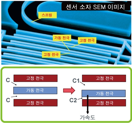 가속도 센서는 MEMS 기술을 사용한 정전 용량 방식의 가속도 센서입니다.