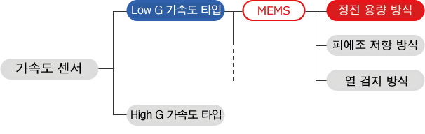 일반적으로 가속도 센서는 하기와 같이 Low G 가속도 타입과 High G 가속도 타입으로 분류됩니다.