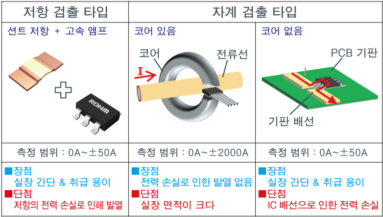 흐르는 전류를 검출하는 방법으로서, 하기 그림과 같이 저항 검출 타입과 자계 검출 타입으로 크게 분류할 수 있습니다.