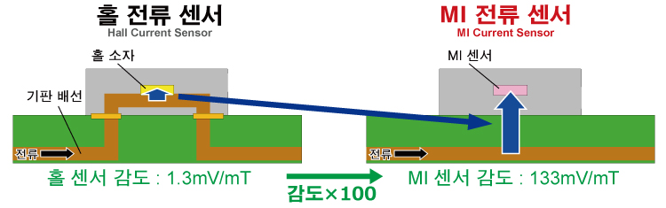 이와 같이 MI 전류 센서는 비접촉으로 전류 측정이 가능하므로, 전력 손실이 적고, 실장 면적도 더 작게 할 수 있습니다.