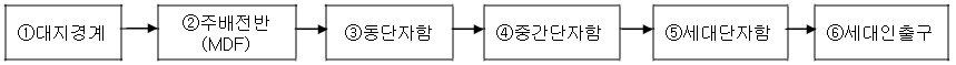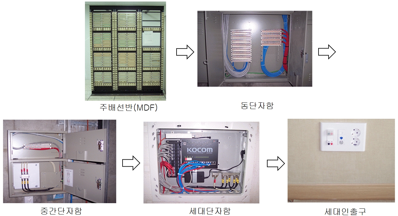 주배전반(MDF)에서 각 세대 인출구(8핀 모듈러잭)까지 계층적 성형방식으로 구성