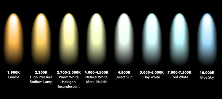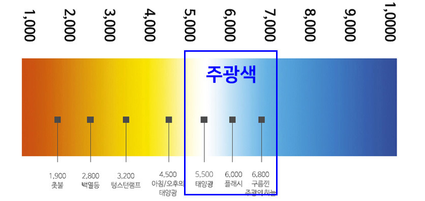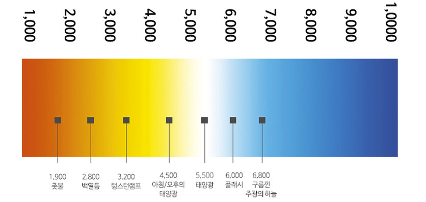 낮은 색온도의 켈빈수치는 빛의 색상이 붉은색에 가깝고 높은 색온도의 켈빈수치는 파란색에 가까운 색상을 띠게 됩니다.