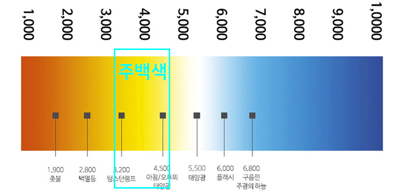 따뜻한 느낌과 차가운 느낌의 중간의 색온도. 주백색은 주광색과 전구색의 중간지점의 색온도