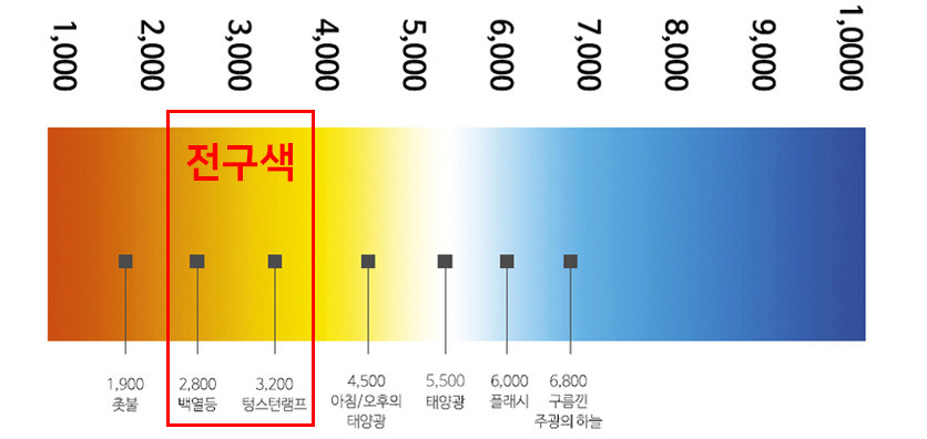 일반적으로 붉은 계열의 색상을 전구색 또는 웜계열의 색상이라고 하며 파란빛(또는 하얀빛)이 도는 색상을 주광색 또는 쿨화이트계열이라고 합니다.