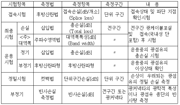 광섬유의 전송특성을 시험하는 항목은 [표1]과 같다.