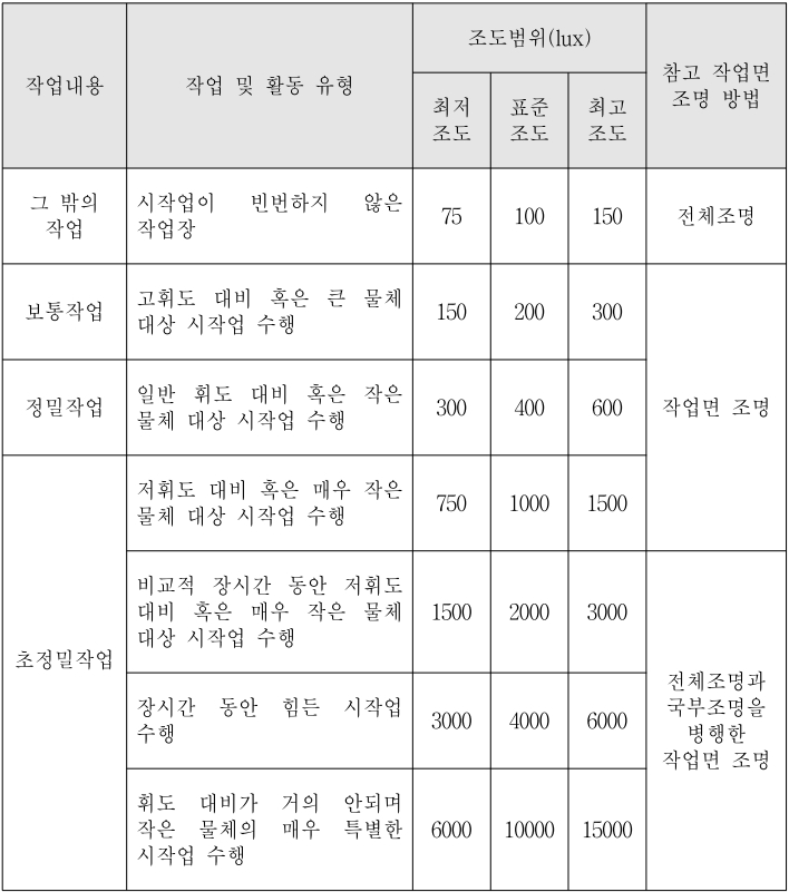 (3)표2 에 표시된 조도는 항상 유지하여야 하는 값을 나타내며,국부 조명을 사 용하여 기준 조도에 맞추는 경우,전체조명의 조도는 국부 조명에 의한 조도의 10%이상인 것이 바람직하다.