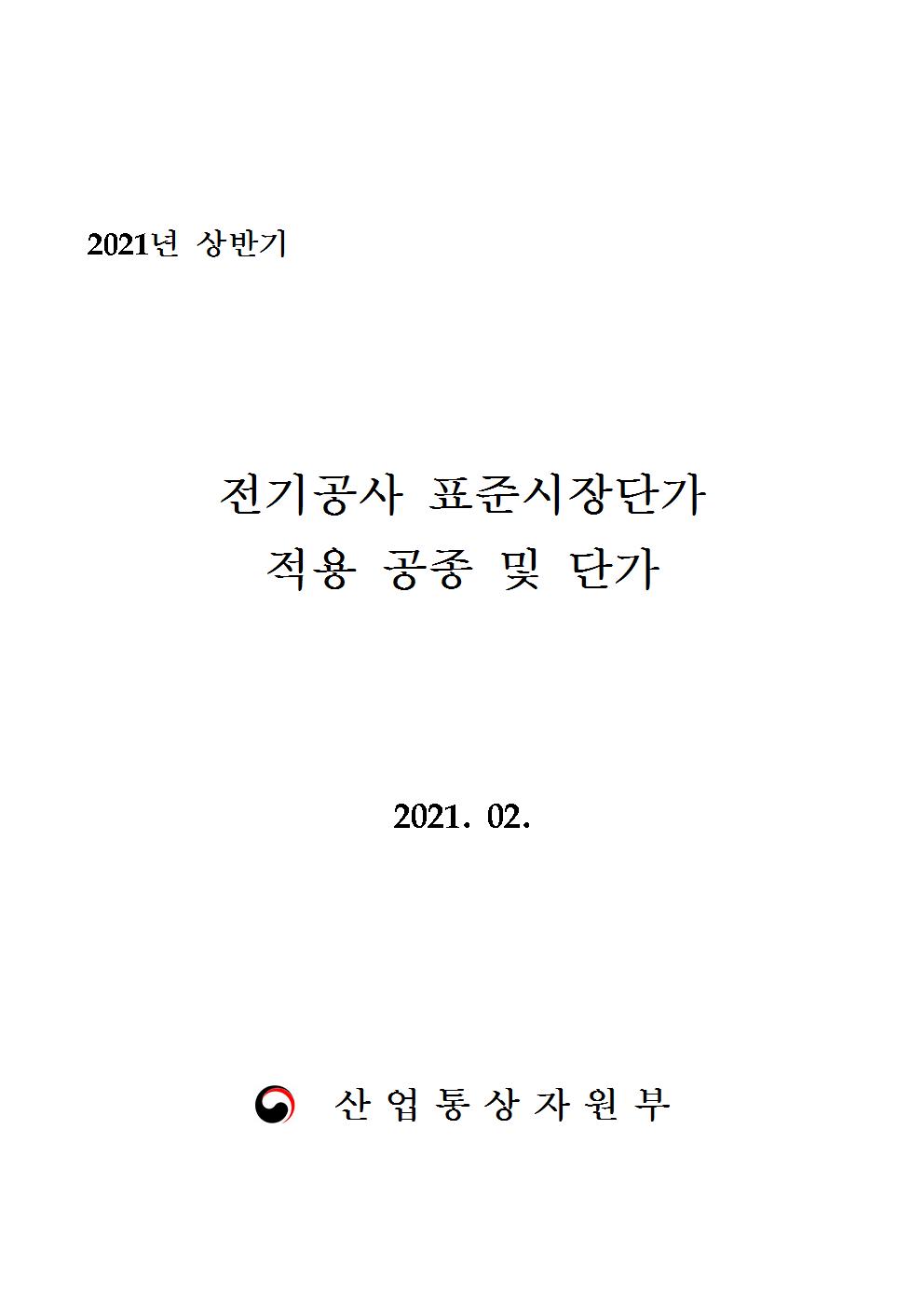 「국가를당사자로하는계약에관한법률시행령」제9조제1항 및「예정가격작성기준(2020. 12. 19. 기획재정부 계약예규 제503호) 제3장 표준시장단가에의한예정가격작성 제38조(직접공사비) 제4항」, 「전기공사 표준시장단가 관리규정(산업통상자원부훈령 제124호 2018.3.16.)」에 의하여 전기공사 표준시장단가 적용대상 공종 및 단가를 공고합니다.