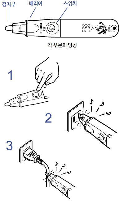 본 기기를 확실하게 잡고 전압이 걸려있는 콘센트 등에 검지부를 닿게 하여 동작하는 것을 확인합니다.
